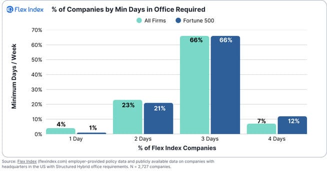 Three-day office requirements now dominate hybrid work policies, with 66% of Fortune 500 companies mandating this schedule—up 5 percentage points from last year. Overall, 78% of firms now require employees in the office 3-4 days weekly, up 9 percentage points year-over-year.